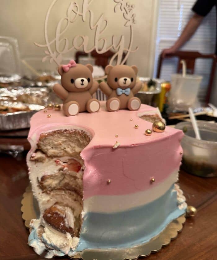 Ordered a gender reveal cake and the bakery forgot to dye the cake the gender color.