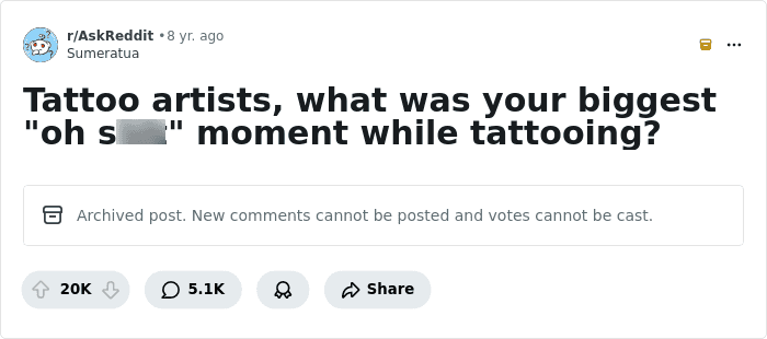 Someone asked, “Tattoo artists, what was your biggest ‘oh sh*t’ moment while tattooing?” and some of the responses are so wild they might remain inked in your mind for a while to come. From one artist spelling “thirteen” as “thirirt,” to dramatic stories that involve clients passing out, and unexpected accidents… It’s enough to make you consider canceling your next tattoo appointment.
