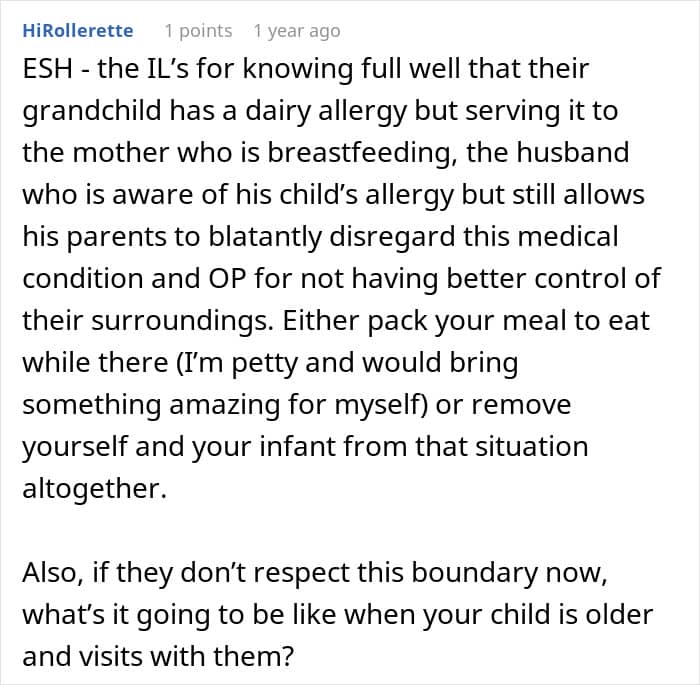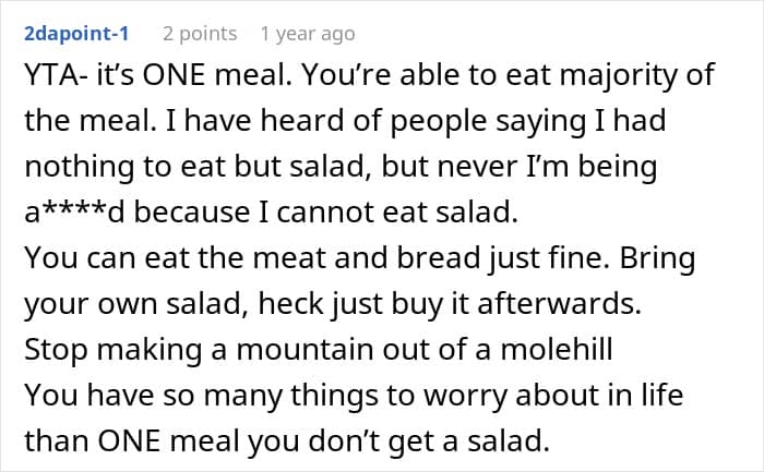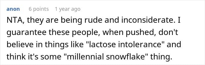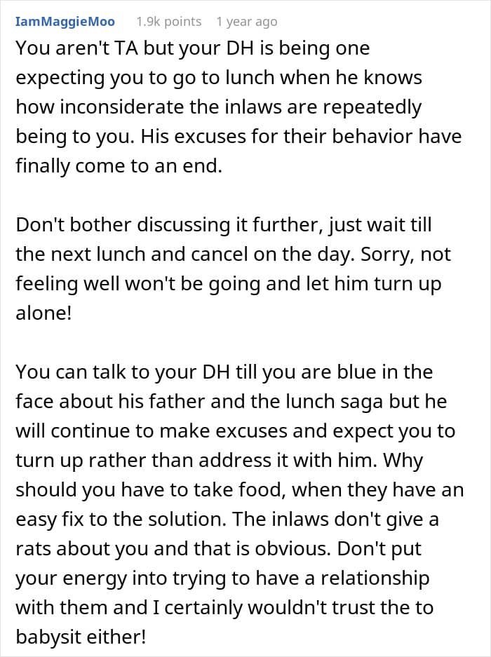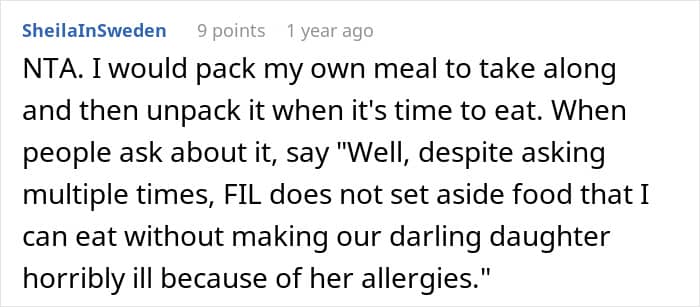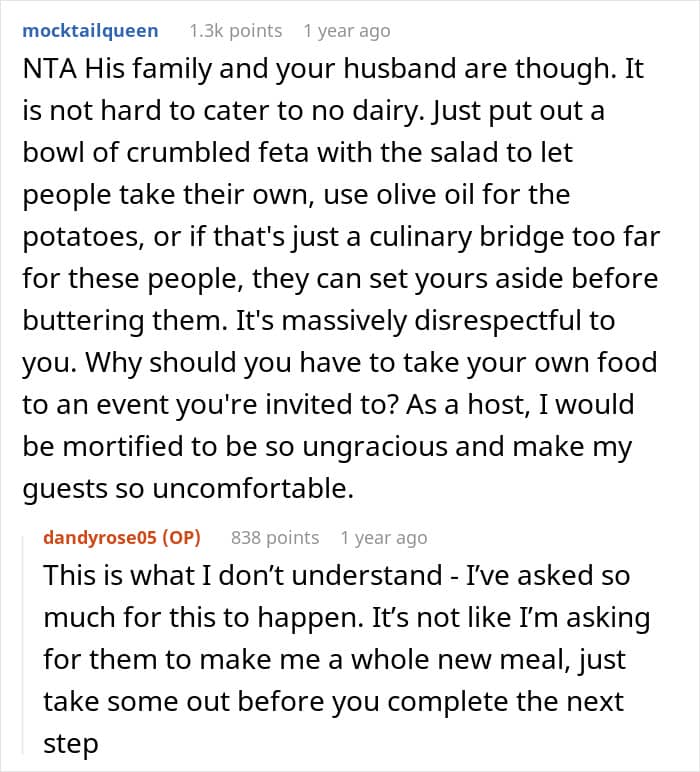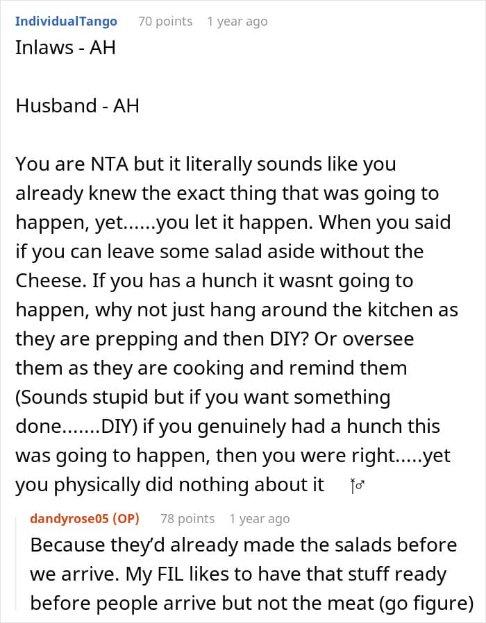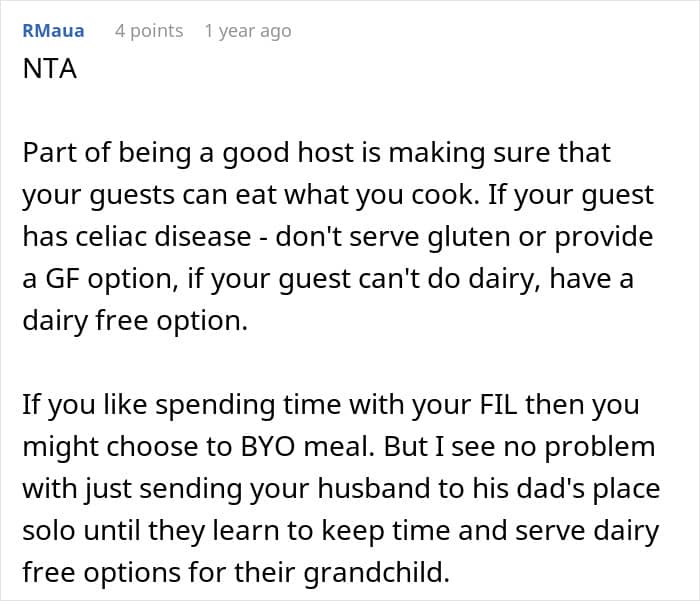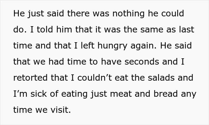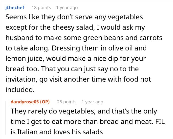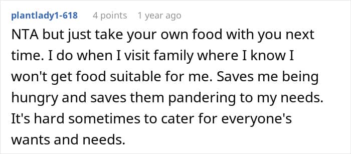 Like this MIL, who, no matter how hard her DIL tried, couldn’t get her to accommodate her dietary restrictions. Finally, having had enough of leaving her family dinners always hungry, she decided not to attend ever again.