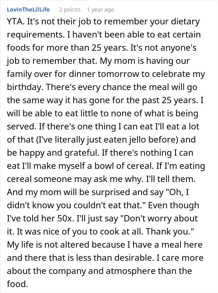 As we can see from the story, living with dietary restrictions often presents challenges to people. Some of the most frustrating, perhaps, are navigating social situations and dealing with a lack of understanding from others. Since people with not-self-chosen dietary restrictions already have a lot on their plate, overcoming challenges daily, the least their loved ones could do is make them feel like a welcomed and accommodated guest in their home by honoring their dietary restrictions, with many experts agreeing with this.