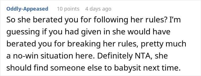 “As a parent, when you leave your child with another responsible, loving adult, you have to accept that they are not you, and therefore the way they respond to your child will not be the way you would necessarily do,” Deiros Collado told us. She says it’s reasonable and appropriate for parents to set some boundaries with a babysitter—for example, a bedtime routine that feels safe and familiar to the kids—and also to set reasonable limits like no tablet after 8pm. But beyond that, you cannot expect someone who babysits your children to ‘parent them’ in the way you would.