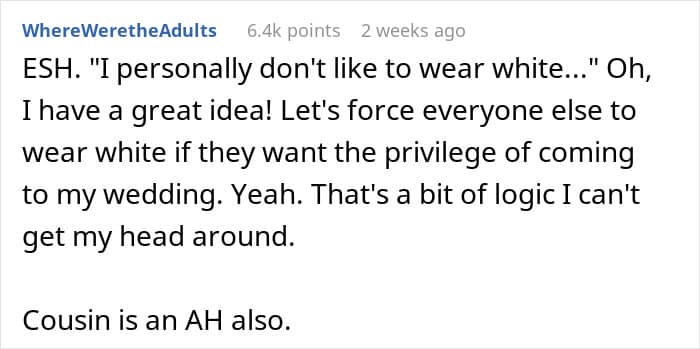 What’s your take on the entire wedding drama, dear Pandas? Do you think the bride, her cousin, or both of them are to blame for how everything went down? How would you react if your guests ignored your wedding dress code? Have you ever seen someone kicked out of a wedding in person? Tell us what you think in the comments section at the bottom of this post.