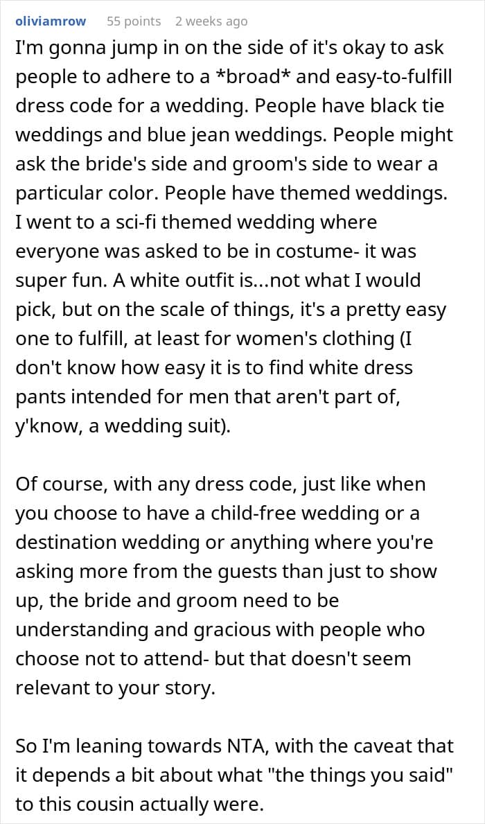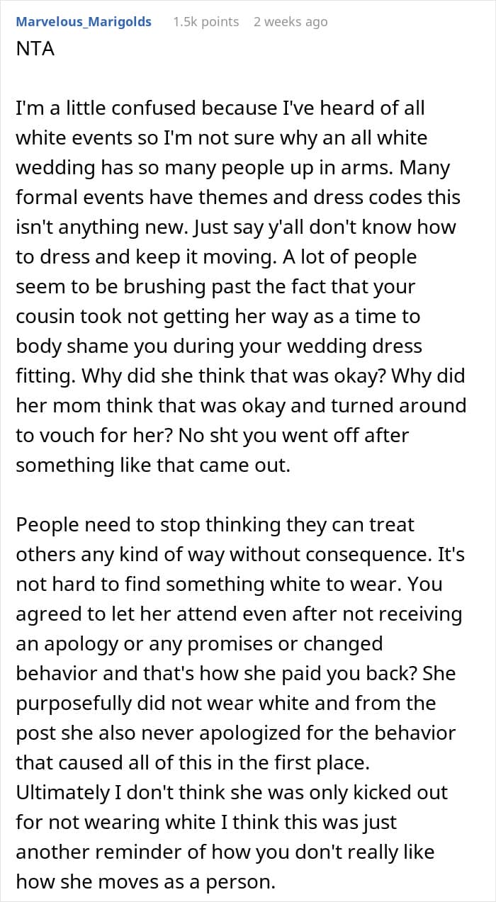 However, despite knowing all of this, some moments can provoke you to clash with your loved ones. One anonymous bride asked the AITA community for its thoughts on her actions at her wedding. She shared how she threw her cousin out who—possibly spitefully—decided to wear a gold dress at an all-white wedding. Read on for the full story. We has reached out to the author to hear about what happened next, and we’ll update the article as soon as we hear back from her.