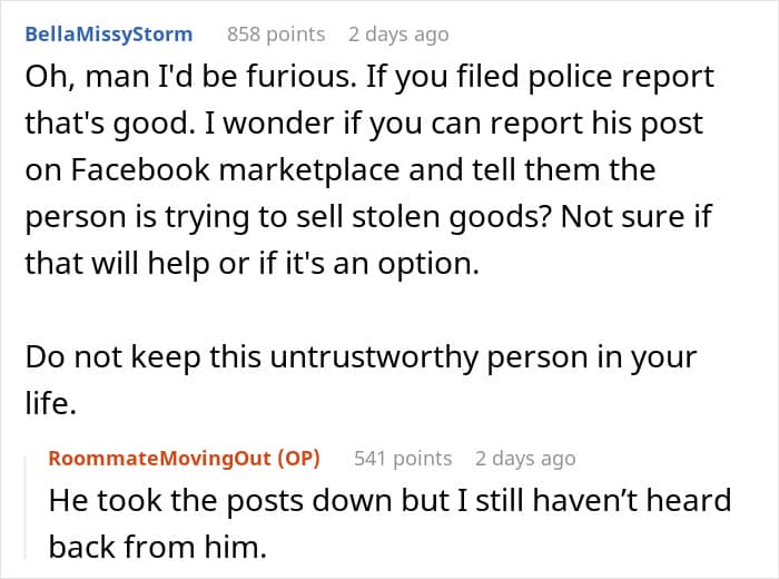 Luckily, support and kind words from other netizens is helping u/RoommateMovingOut to stay level-headed. “A lot of people shared their experience with me through comments and messages. Many said that experiences like mine have led them to have less trust in others.”