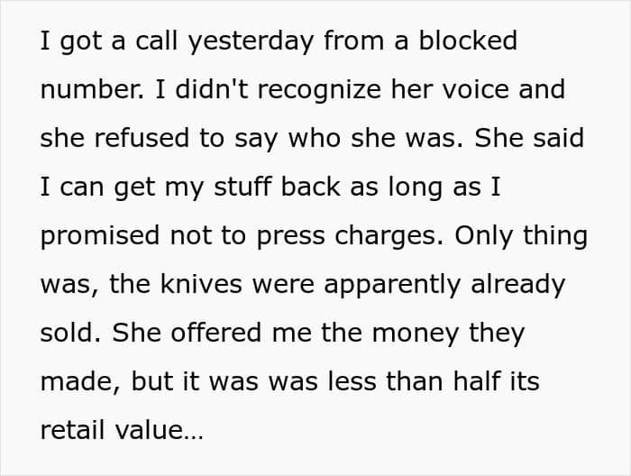 “The caller was very matter-of-fact and no nonsense. She seemed annoyed by the situation. She basically outlined what they could return and what they sold and said if I want it back, I could have it, and we could forget it happened. I think, because she sounded so emotionless about it, that I was more annoyed with her than angry. I called my dad right away afterwards,” the OP says.