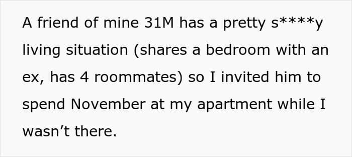 “Starting in September, four friends (including him) and I had been doing a weekly potluck,” she adds. “He hosted in October, and I really felt the high stress of his living situation. That night ended with him shutting down and shutting us out. Because it was someone I knew so well I didn’t think twice when it came to offering him my place for the month,” the OP says.