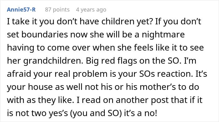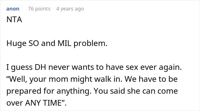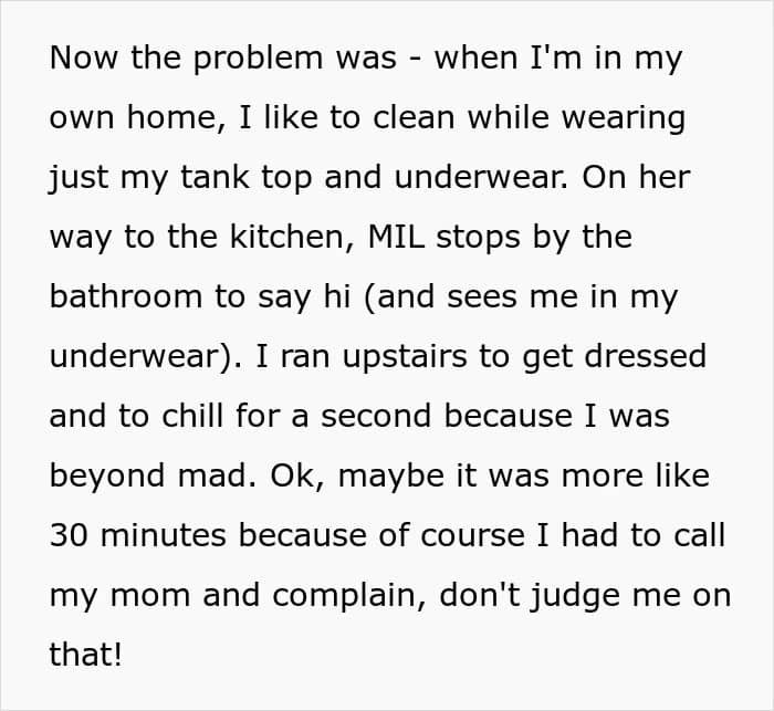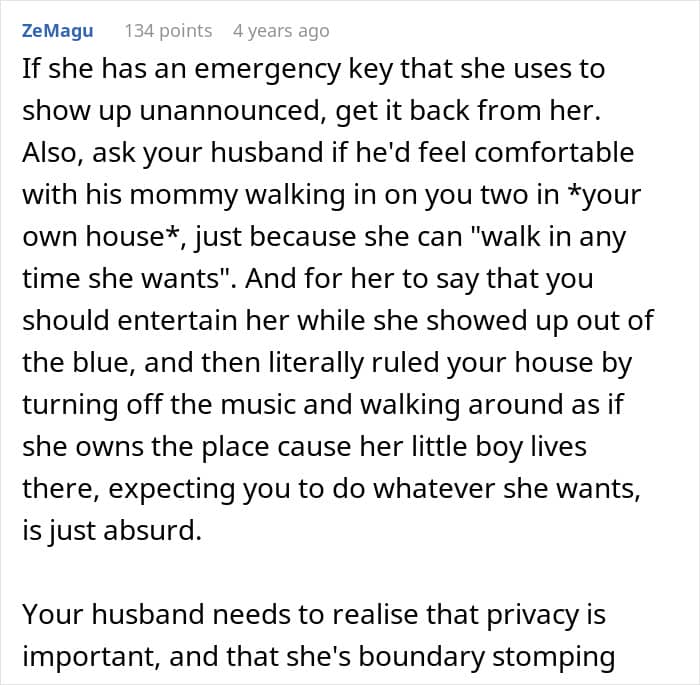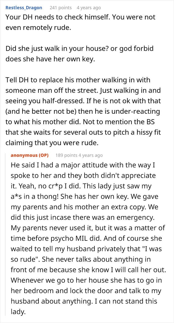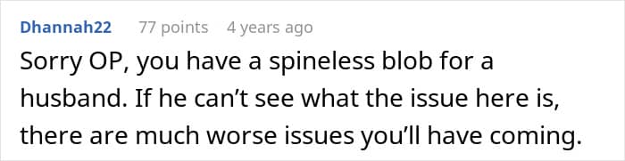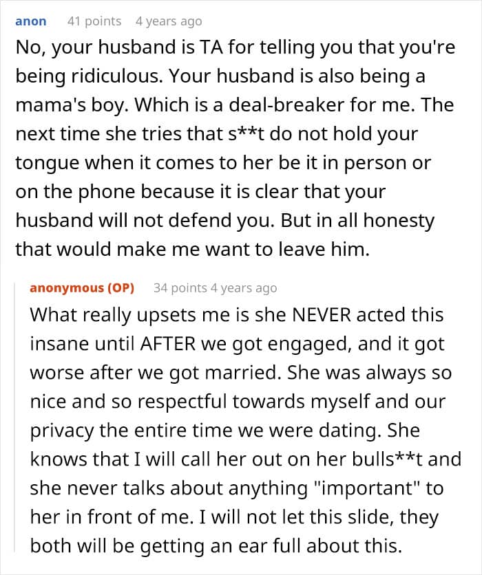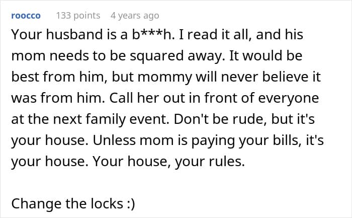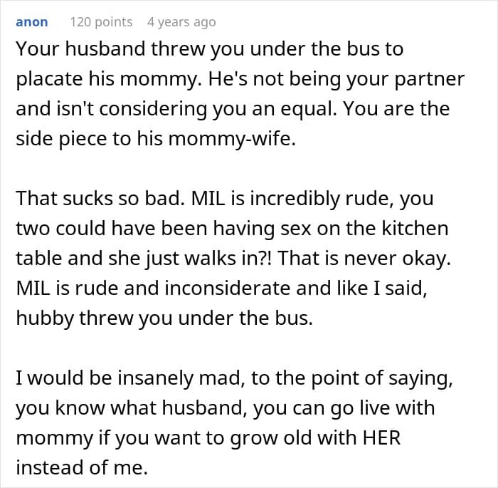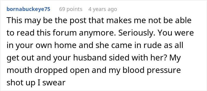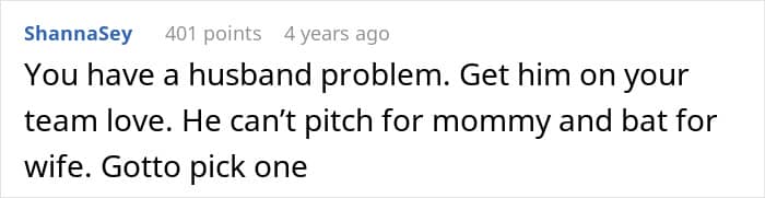 Unfortunately, her husband does not take her side in this particular story. This is often one of the main issues people face when it comes to horrible in-laws. They need their significant other to back them up but they either pretend to not see the issue or even take their parent’s side. As many of the commenters noted, she has as much a MIL problem as she has a husband problem.