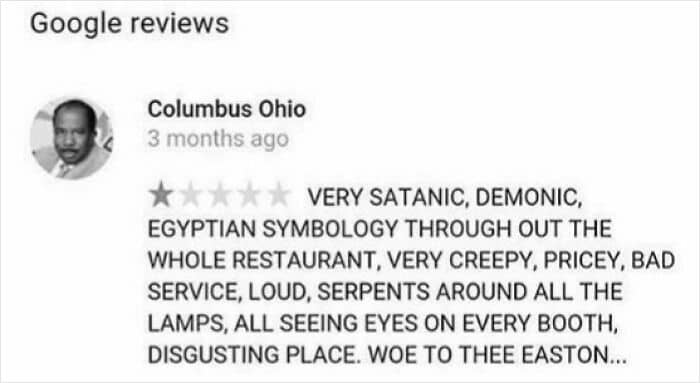 But that’s the beauty of reviews on the internet. They’re not reviews; they’re glimpses into the horribly complicated inner lives of strangers. Sure, now and then you learn whether the tacos are good or not, but more often than not you learn that Barbara from Wisconsin has very strong feelings about how ketchup packets are dispensed.