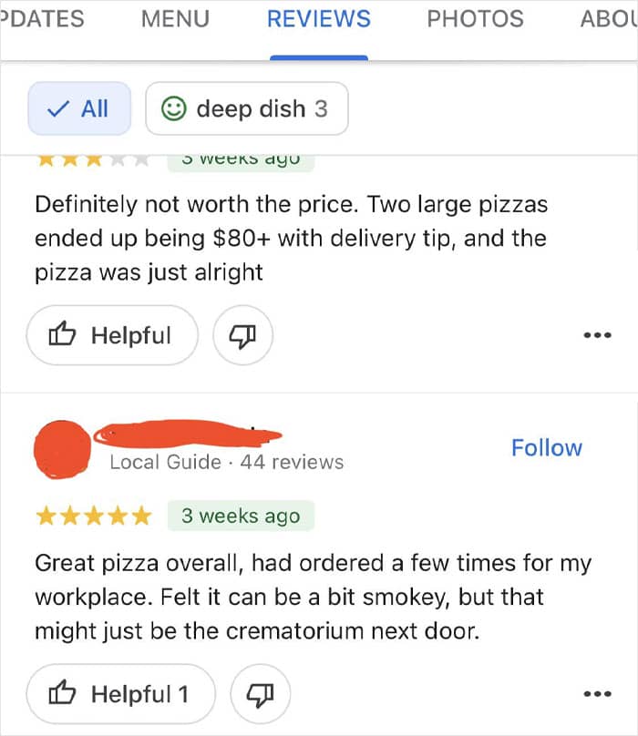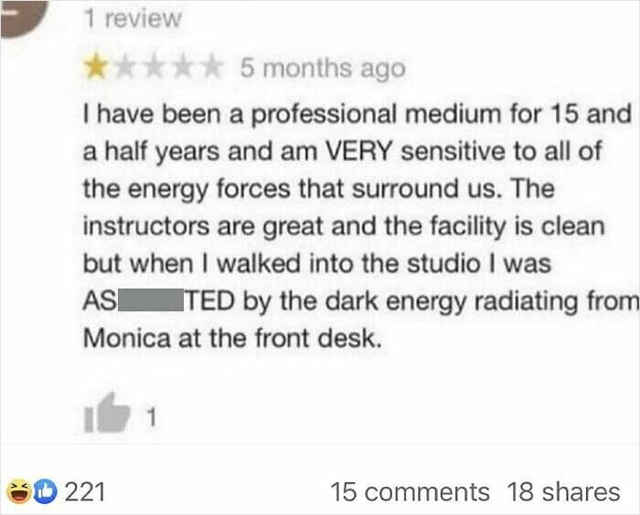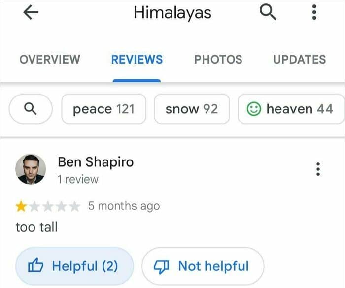 And then there are the people who clearly have no idea what reviews are. A review of a museum: “One star didn’t go inside.” A review of a coffee shop: “Four stars, haven’t tried the coffee yet.” That’s rating a book you never opened or Yelp feedback for your neighbor’s dog for barking once.