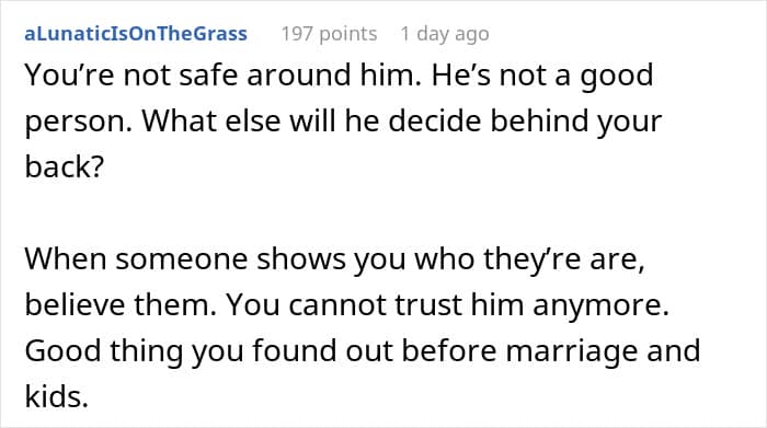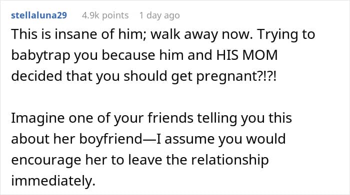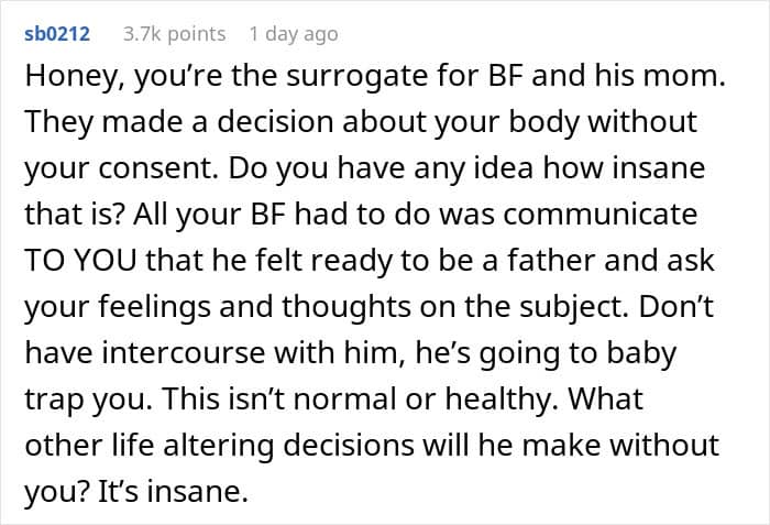 This behavior is very troubling, because, again, interfering with the health of your partner is not normal at all and should not be tolerated. Fortunately, many of the commenters (some examples can be found below) did their best to express support and tried to ensure she got out of this relationship. Having a child is something both partners need to agree on, anything less is a dealbreaker.