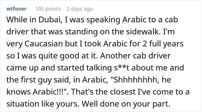 “I’ve actually experienced something similar while I was abroad,” Lisa told us. During a taxi ride with a local friend, the driver started commenting on her appearance, calling her “hot” and asking her friend if she was his girlfriend. “He had no idea I could understand every word because I stayed quiet the whole time,” she recalled. But things took a turn when the driver began insulting her for being a foreigner.