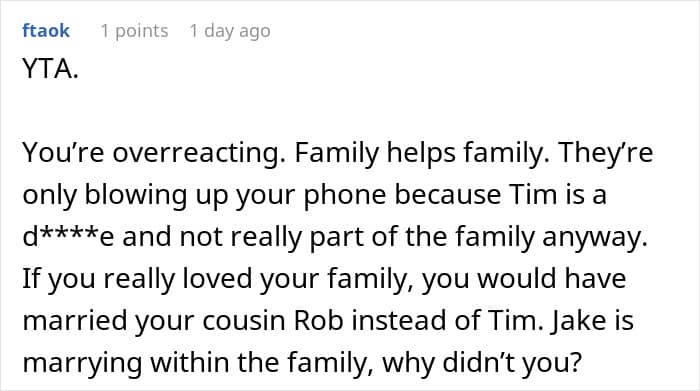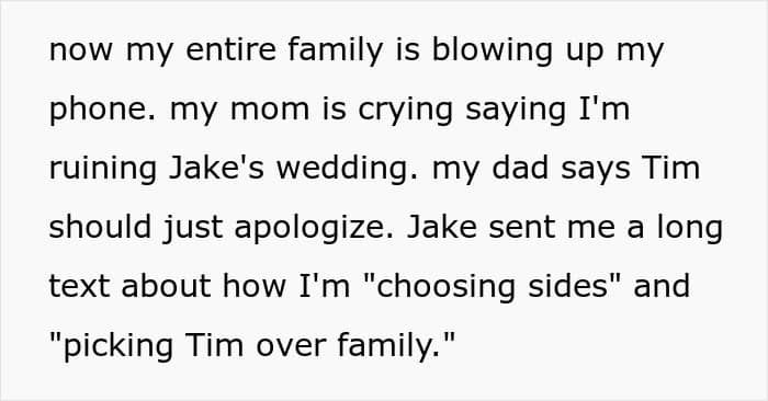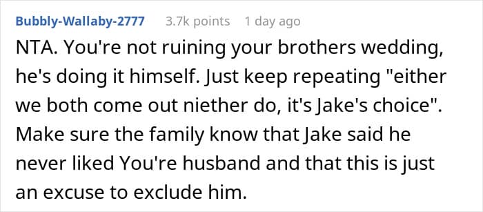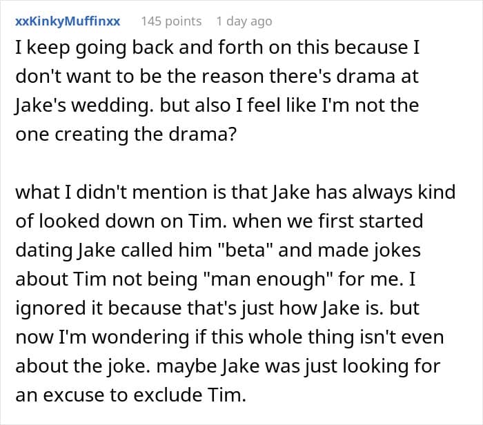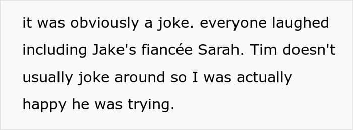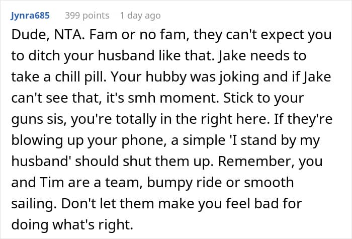 One Redditor found herself caught in the middle of family drama ahead of her brother’s big day. During a get-together, her husband made what he thought was a harmless joke in front of the groom. The comment didn’t land well, and he was promptly uninvited from the wedding.