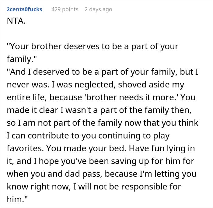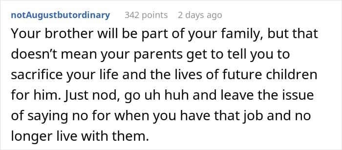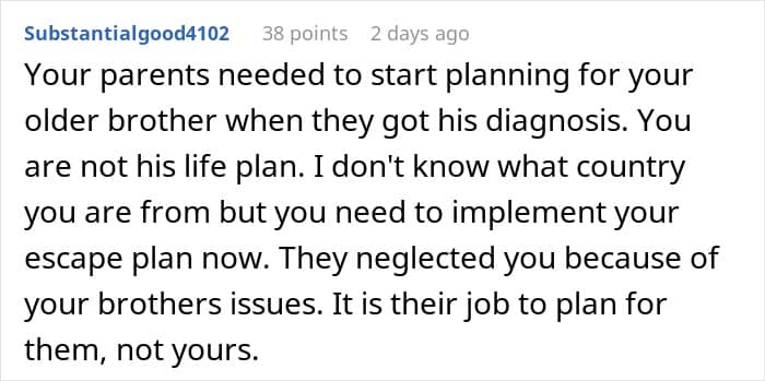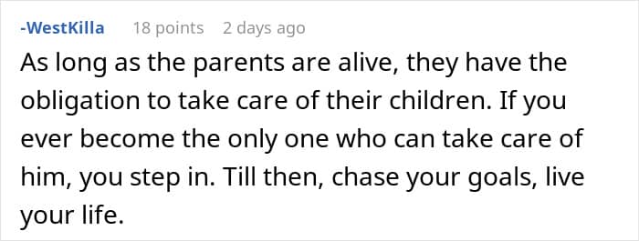 Netizens affirmed that the OP is not responsible for her brother’s care or her parents’ expectations. They emphasized that the neglect she experienced as the “healthy sibling” makes it unfair for her parents to demand sacrifices from her. They advised prioritizing her own life and future, even suggesting moving out or limiting contact if necessary.