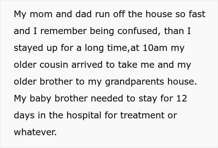 The brother ended up staying in the hospital for twelve days, during which the parents focused on outings and appointments for him and the older brother, while she got nothing. Whenever they returned from an outing, the OP would ask if they had brought her anything, only to be told that her “brothers deserved it more.”