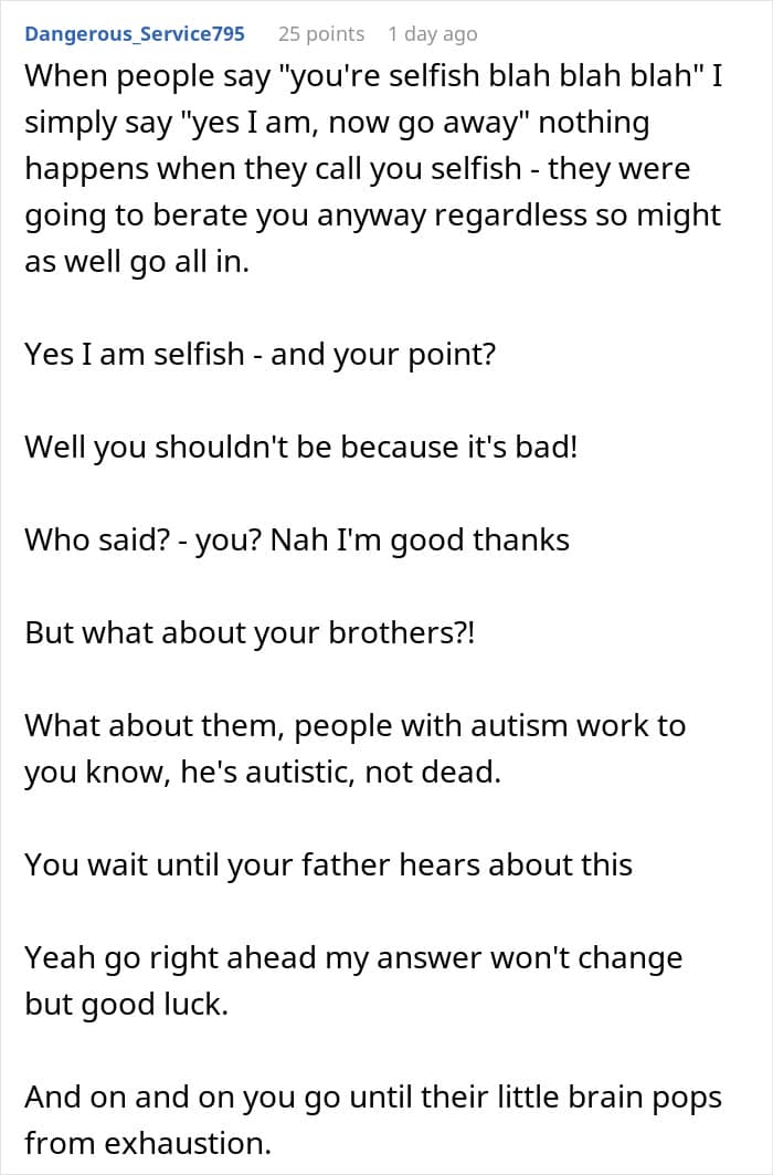 Today’ Original Poster (OP) spent most of her life living in the shadows of her brothers, who had autism and epilepsy, respectively. Never really considered or looked after, she mapped out her dreams for the future, until she was told she was expected to include her brothers in it.