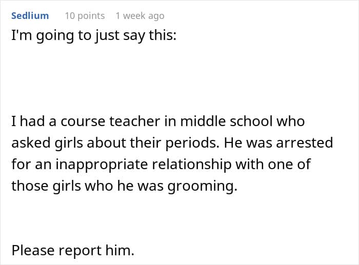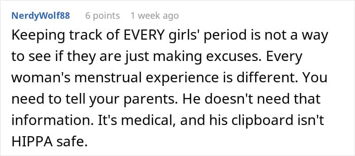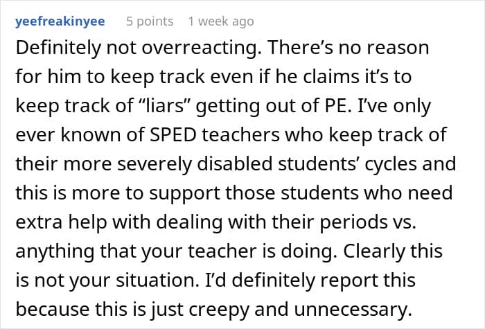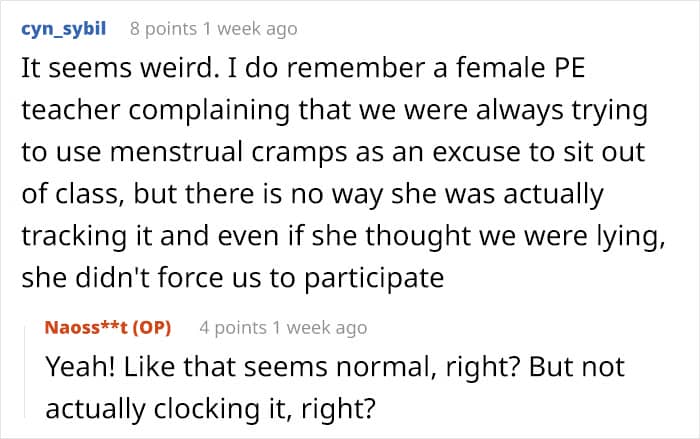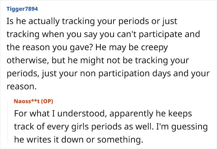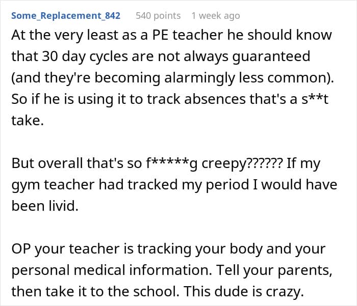 But physical education can be even more difficult for girls and teens when they’re suffering from debilitating period cramps or have a teacher that puts them on edge. Below, you’ll find a story that one high schooler recently shared on Reddit asking for advice after she realized that her P.E. teacher had been keeping tabs on students’ menstrual cycles.