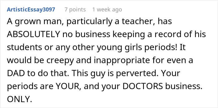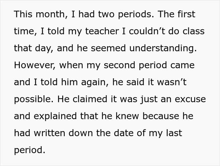 While this isn’t always an easy topic for students to bring up to their teachers, it’s important that teachers don’t do anything to make students feel even worse, or feel ashamed in any way. The teacher in this particular story seems to be confused about the fact that this teen doesn’t have a regular period. But that’s actually perfectly normal for kids and teens.