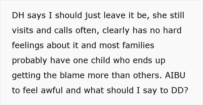 This was a real blow for the mom. In the following days, she reflected on and recalled her reactions from years ago and came to the conclusion that she’d always unconsciously assumed this daughter was to blame “by default.” Simply because she had always been more defiant and disobedient than the others. So the OP is tormented by remorse, and she’s torn between offering an apology or just letting it slide.