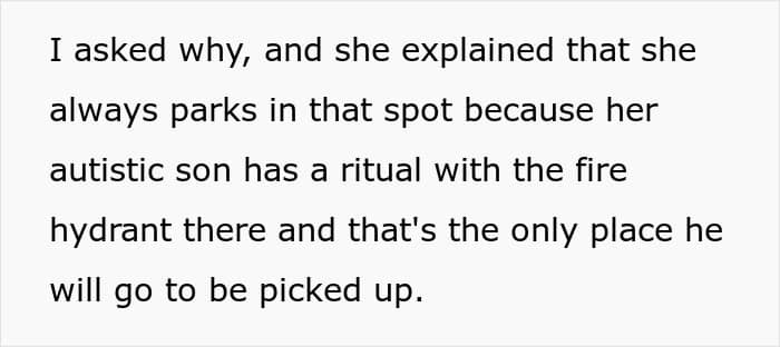 The mother’s request for the parking spot is rooted in a valid and important aspect of supporting an autistic individual. Milestones Autism Resources explains that predictability and routine are often crucial for helping autistic people navigate a world that can feel chaotic and overwhelming. The fire hydrant ritual was a predictable anchor in the boy’s day, and the mother’s desire to maintain that was understandable.