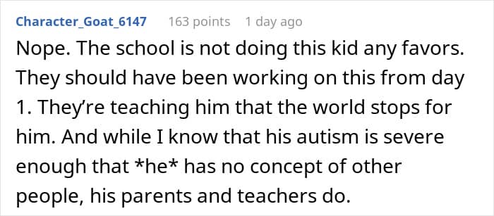 While the mother’s intention was to protect her son from distress, expecting the entire world to bend to his routine is an unsustainable long-term strategy. The school and the mother have a responsibility to help him build the resilience needed to handle minor disruptions, like a car being in the wrong spot.