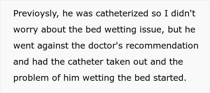 The OP explained that her husband suffered from serious heart problems and depended on her for nearly everything, from cooking, cleaning, managing medication, to watching over his side effects, which included excessive urination, leading to repeated bedwetting incidents. The husband had previously used a catheter, but he chose to have it removed against his doctor’s advice.