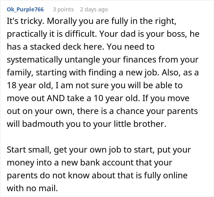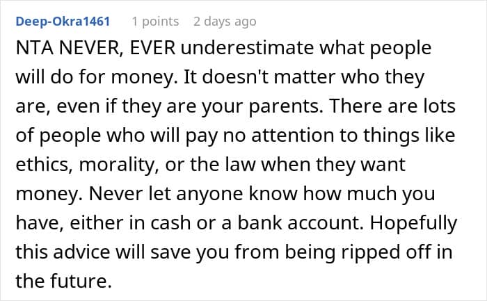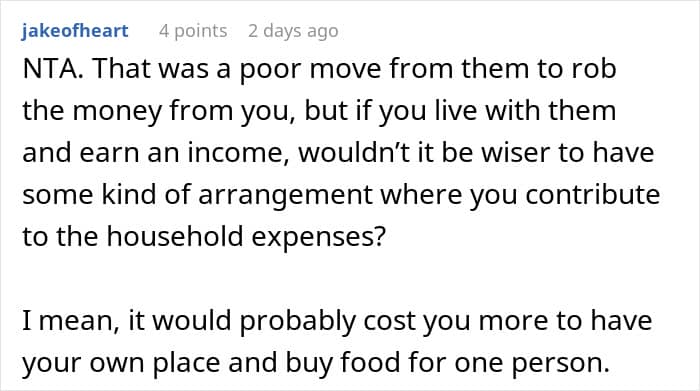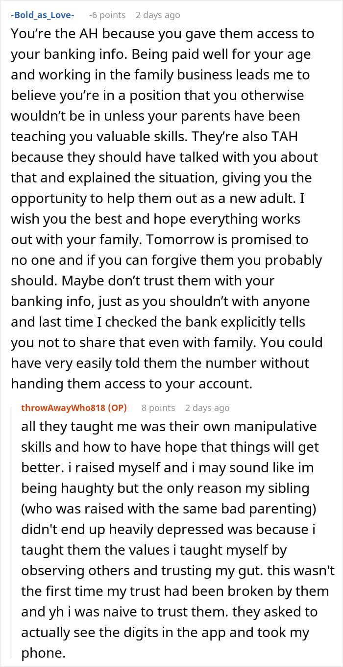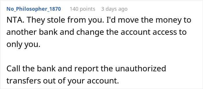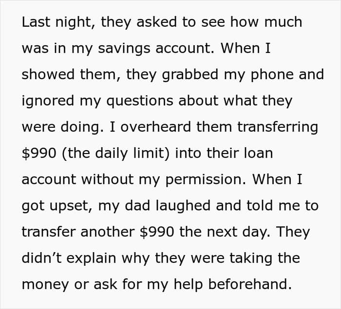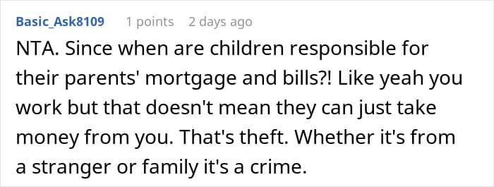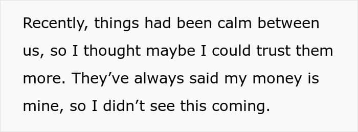 But in this case, the teen had already been working hard and saving for her future, showing responsibility beyond her years. She may have contributed to her parents’ budget if they had asked her directly, but taking the money behind her back not only broke her trust—it sent a message that her efforts didn’t matter (or belong to her) at all.