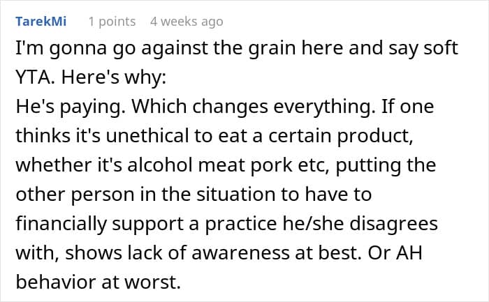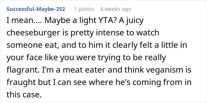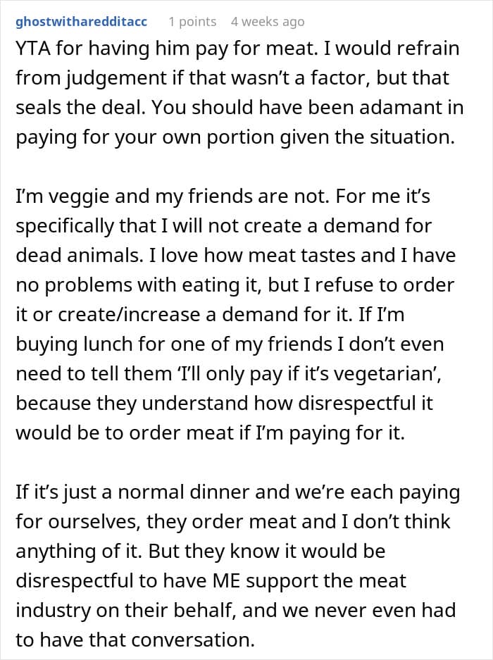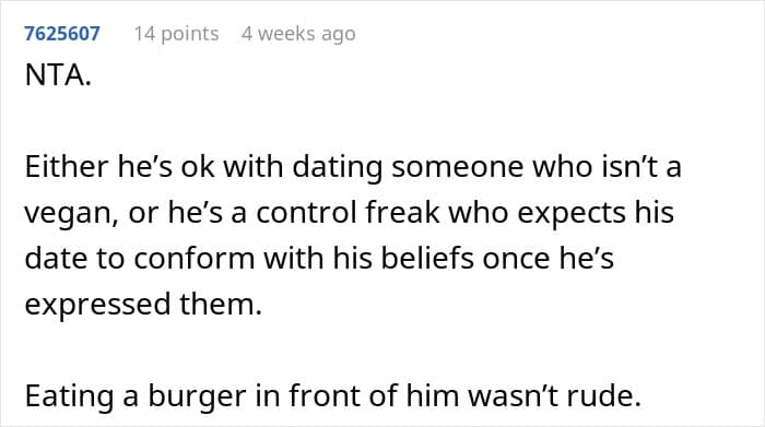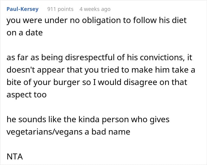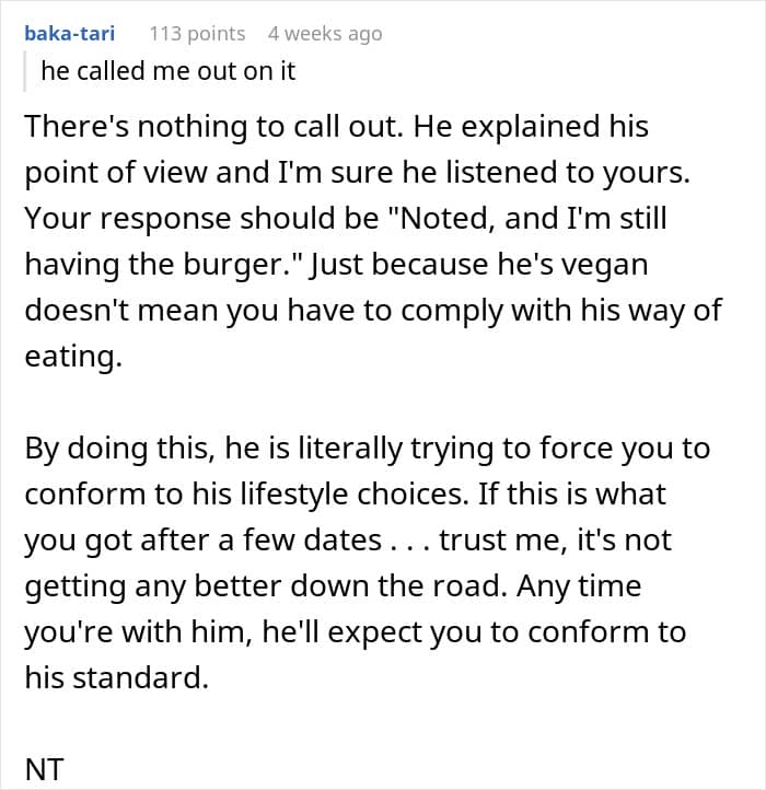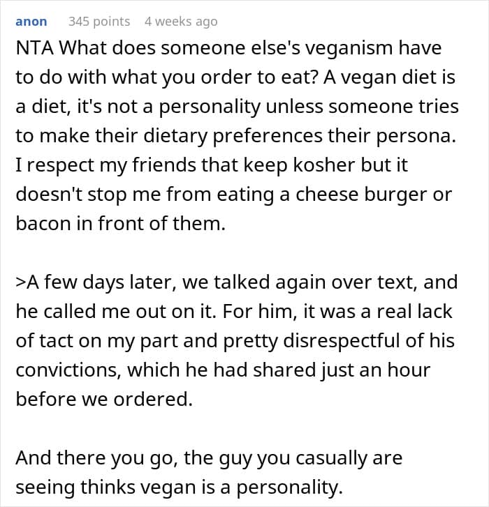 It’s one this Redditor has been mulling over after a third date with a guy she described as “funny, brilliant, and intelligent” didn’t quite go as planned. During the meal, he casually mentioned he was vegan, which she took in stride. But when it came time to order, the woman didn’t think twice about getting a burger.