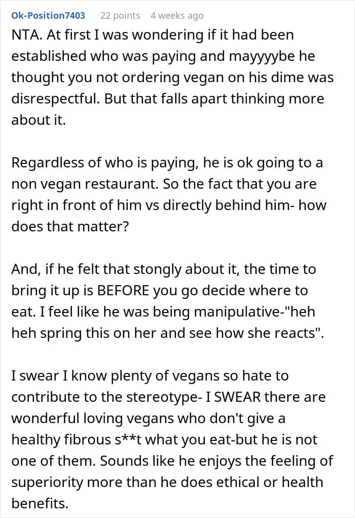 “That said, in the context of the first few dates, where you’re trying to put your best foot forward, it would have been a thoughtful gesture to order something vegan as a sign of respect,” she adds. “However, if the man expected both people to eat vegan, he should have made that clear from the start to avoid any awkwardness.”
