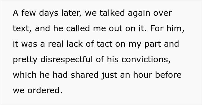 Days later, though, the man sent her a text calling her choice “disrespectful.” Now, she’s wondering whether she may have been out of line.