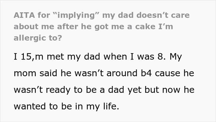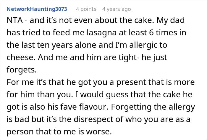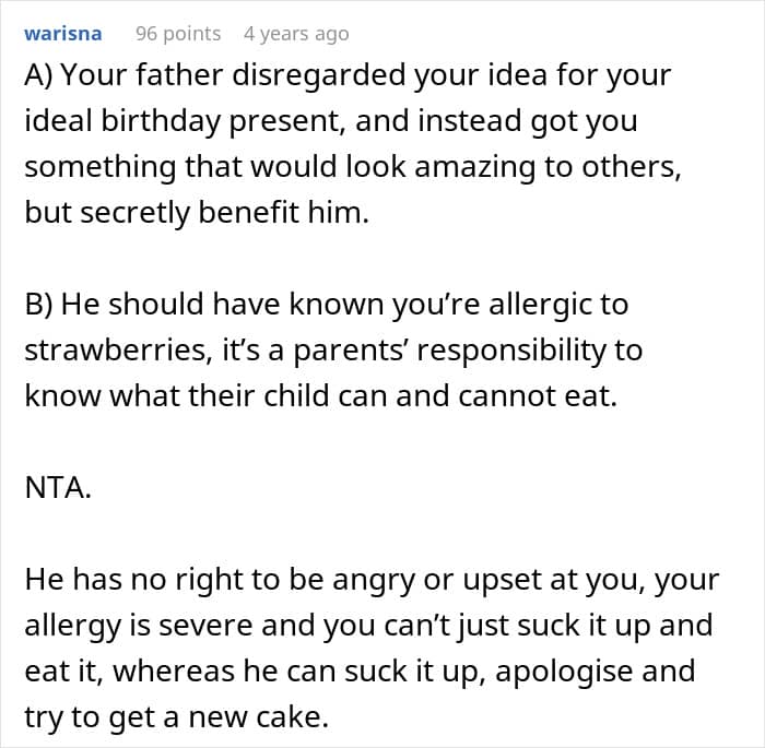 Like this dad, who, for his son’s birthday, bought a strawberry cake, which he’s severely allergic to. Since this wasn’t the first time the parent exhibited such self-centered behavior, his teen called him out on it, which made him super mad.