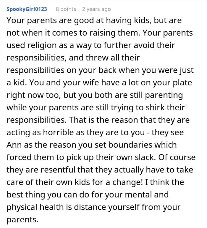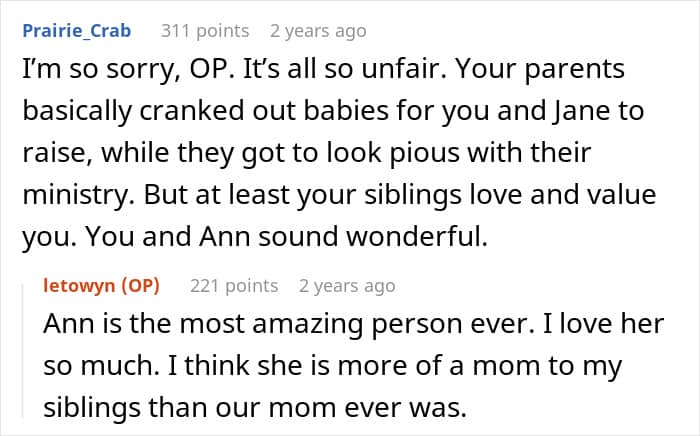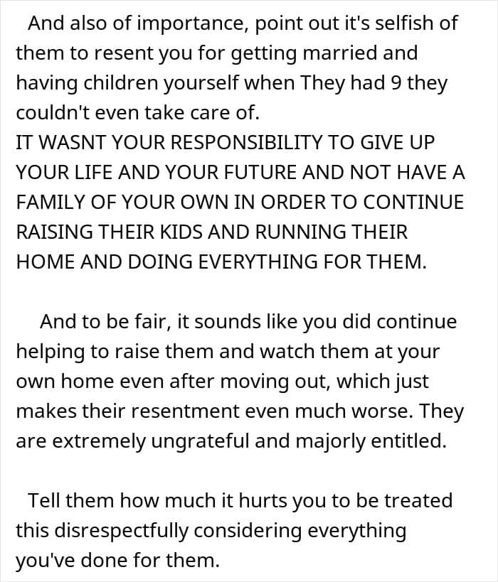 Take, for instance, a man who shared his experience of essentially becoming a “third parent” to his seven younger siblings while his parents focused on their large family and ministry. Now, as an adult facing health challenges and raising kids of his own, he says his parents resent him for gaining independence and refuse to offer any support.