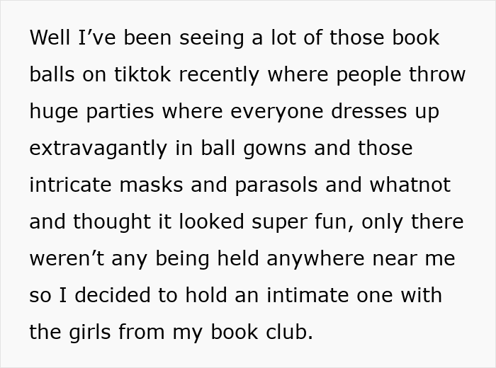 RELATED:A woman shared how she decided to host an elegant ball-themed party for her book club, inspired by the grand book balls trending online