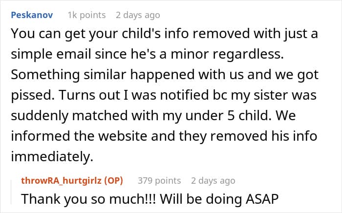 People gave the mom advice about how to remove her child’s information from the database