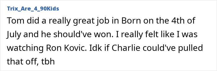 Charlie praised Cruise’s performance in the 1989 film, saying he “should have won the freaking Oscar”