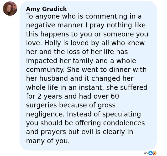Melissa Fullerton Lovett who knew the deceased mother-of-three said Holly had to undergo more than 60 procedures “in this small amount of time.”