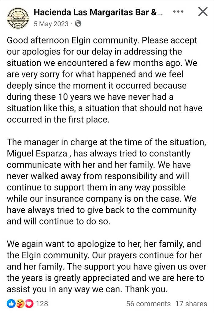 “Good afternoon Elgin community. Please accept our apologies for our delay in addressing the situation we encountered a few months ago,” the restaurant said at the time.