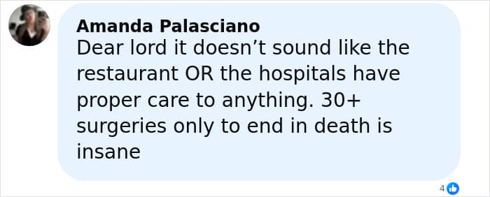 After suffering chemical burns, Holly had sued the local restaurant and eventually reached a settlement. She had herlast medical procedure on October 17 this year, initially showing signs of recovery.
