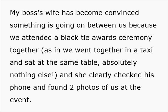 What the OP never expected was to get in trouble for simply going with her boss to a black tie event. Even though they just shared a taxi and sat at the same table at the ceremony, the boss’s wife saw a photo of them together and began suspecting all kinds of things. She texted the poster multiple times, trying to pry and figure out if something was going on.