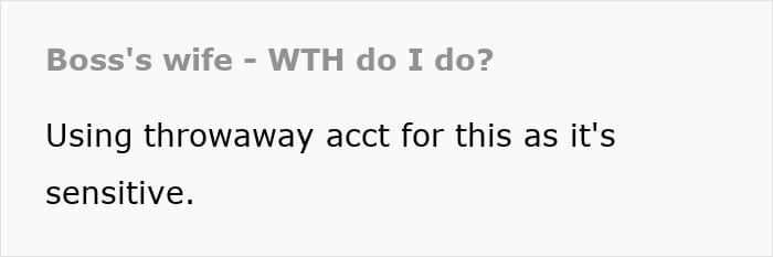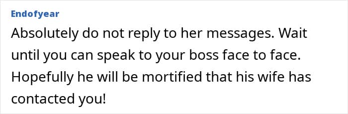 The poster explained that she didn’t have much contact with her boss in general, which is why she was so baffled when his wife texted her. She felt trapped by the other woman’s accusations and didn’t know whether she should respond or ignore the issue completely till the texts stopped coming.