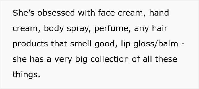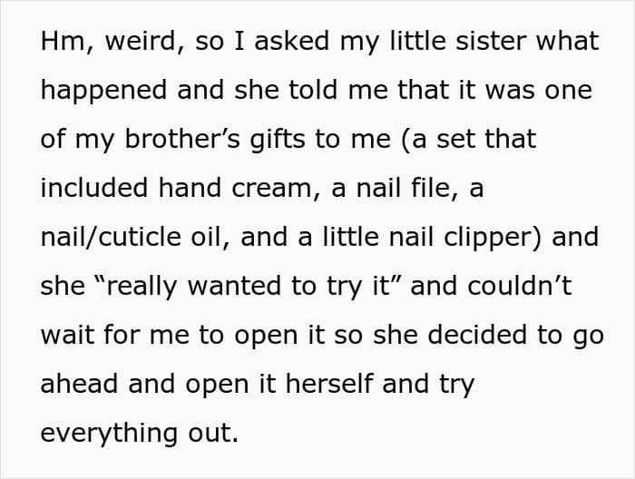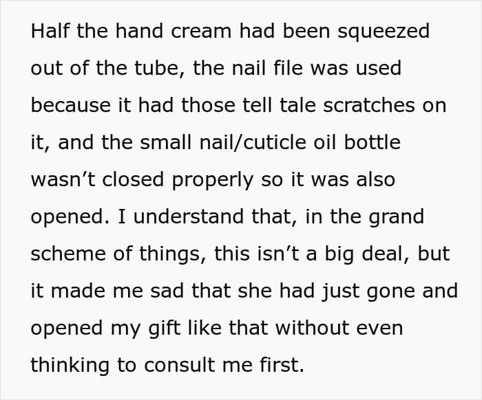 She also noted that her sister would get upset whenever the OP wouldn’t share her gifts with her. However, the tension hit its peak on the OP’s birthday. While opening presents, she noticed one gift had been tampered with which was a hand care set from a brother. The younger sister admitted she had “really wanted to try it” and couldn’t wait, leaving half the hand cream used.
