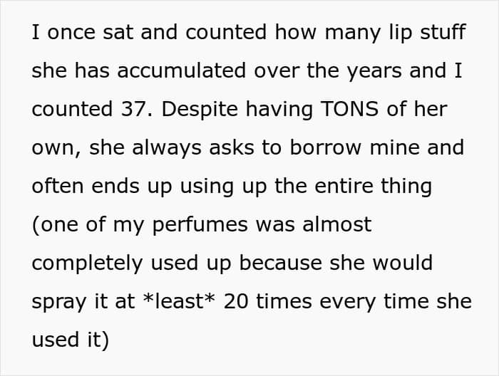 The OP shared that her younger half-sister has an impressive obsession with beauty products from lotions, perfumes, lip balms, to hair products. In fact, she had amassed so many lip glosses that the OP once counted 37 separate tubes. And yet, despite having her own stash, she frequently asks to borrow her things, sometimes using them up almost entirely.