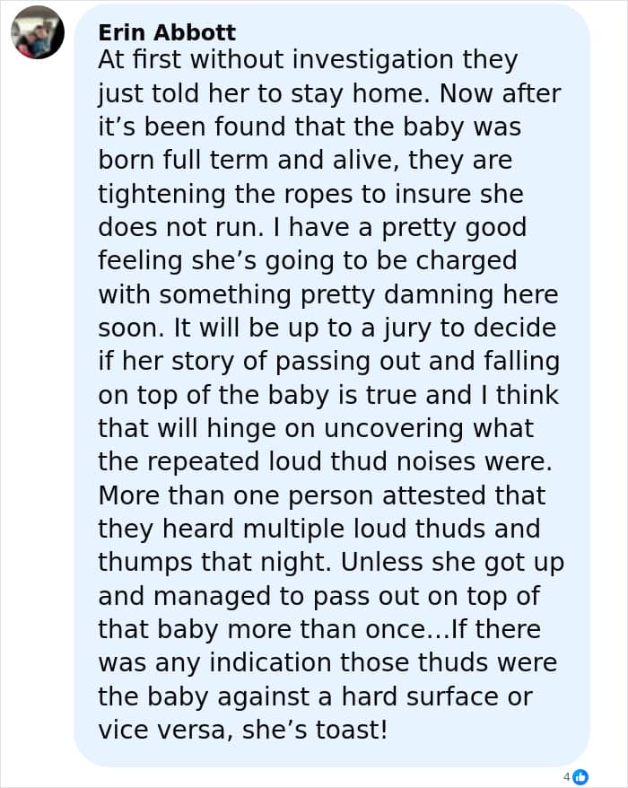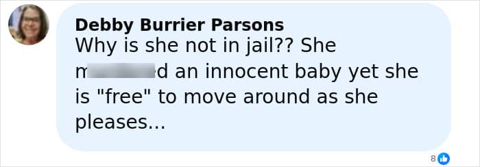 “She should be charged with m**der. Why isn’t she in jail like most m**derers would be?” one commenter wrote. Another argued, “An alleged stillborn birth is not a c**me. Attempting to conceal said alleged stillbirth and going about your day, a c**me worth paying for.”