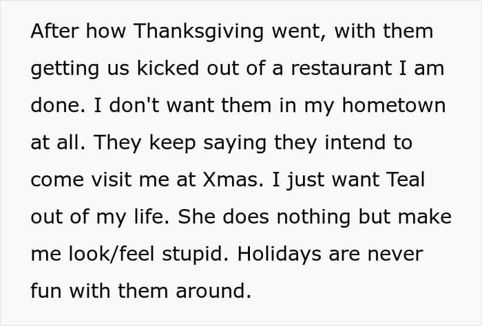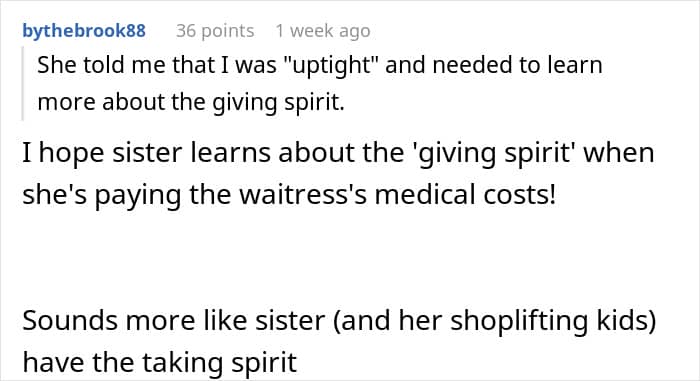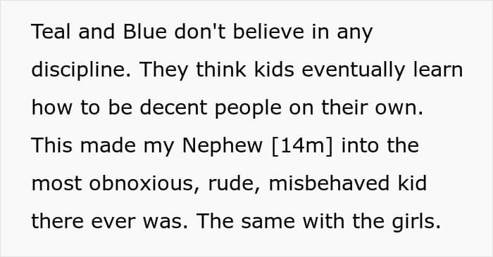 The OP (original poster) has a sister, Teal, and a brother-in-law, Blue – yes, let’s go with crayon names. The couple is raising 3 kids under the philosophy of “discipline is unnecessary.” Which sounds poetic in theory, until it lands you kicked out of restaurants because the kids caused a waitress to burn herself. Ouch!
