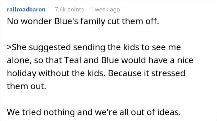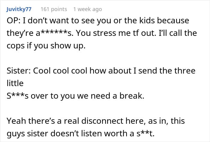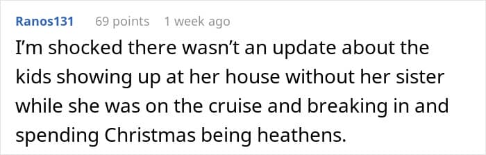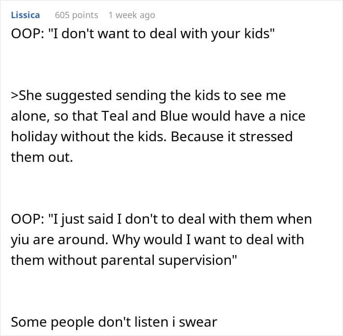 But for years, the OP tolerated it. She’d even book herself into a hotel just to survive visits, because nothing screams “family bonding” like avoiding the family home altogether. But after one too many “kids will be kids” speeches from Teal and Blue, the OP decided she was done playing the role of the “uptight” aunt.