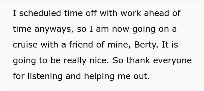 After a heated chat with her sister, the woman decides to cut contact and go on a cruise instead of visiting the family