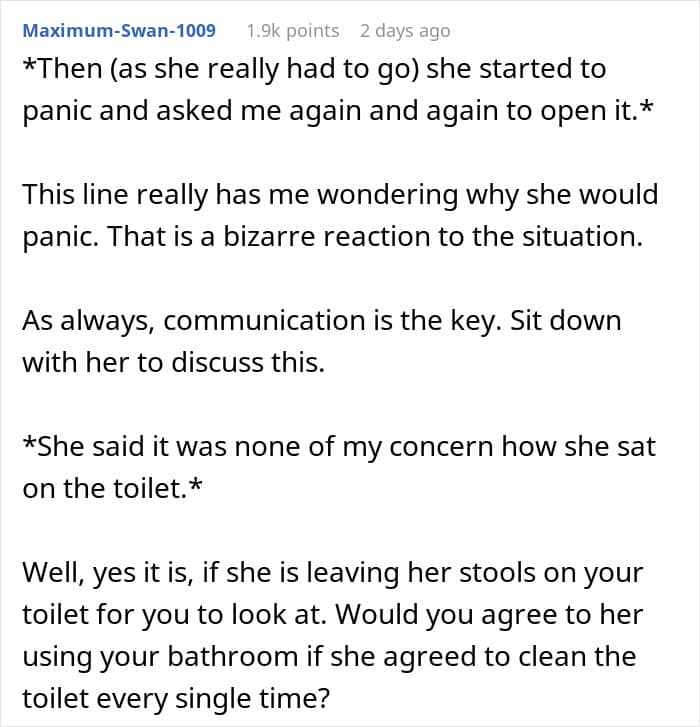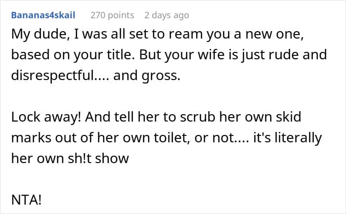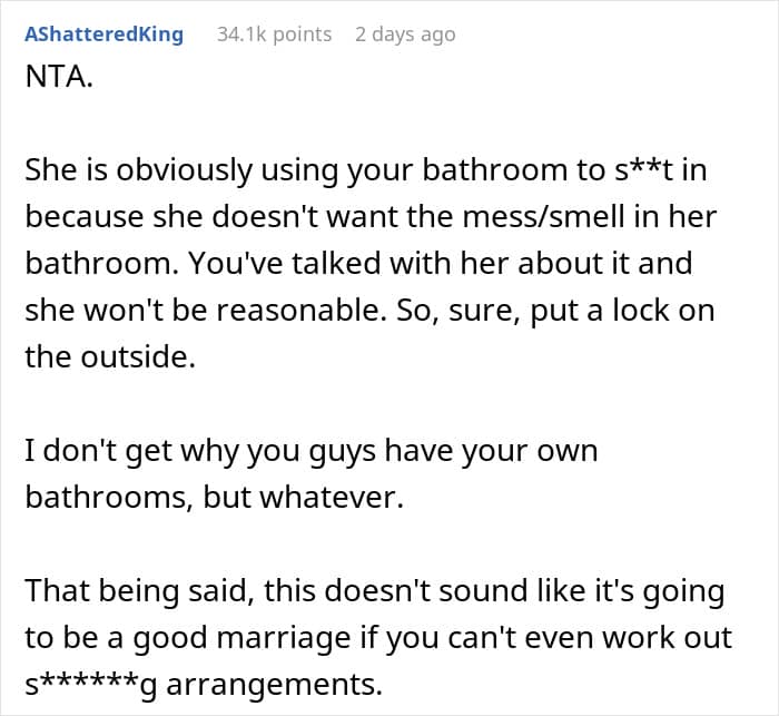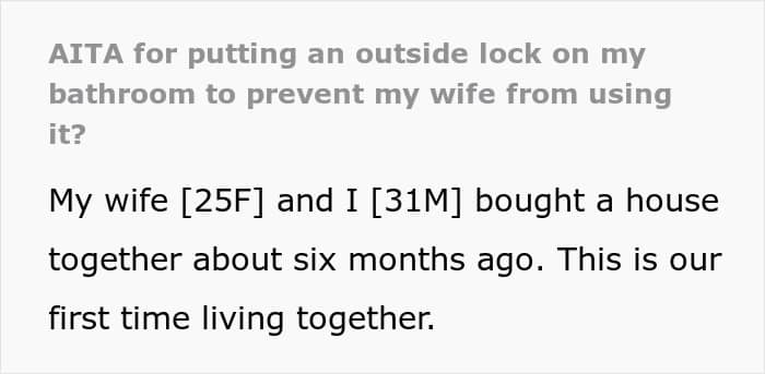 A man asked the internet if he maybe went too far when he placed an actual lock on his bathroom to keep his wife out, as her method of using it caused him discomfort. While on the surface, his solutions might look extreme, he gave some details that perhaps vindicated his decision.