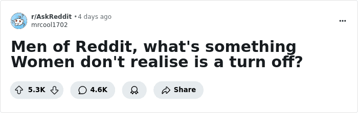 Chances are, quite a few people have been in such a situation, or at the very least have given thought to what they consider a turn off, as they came up with plenty of examples when asked about them online. A number of netizens shared their opinions in a thread started by one member of the ‘Ask Reddit’ community, who wanted to know what things women do that men consider to be turn offs.