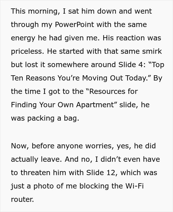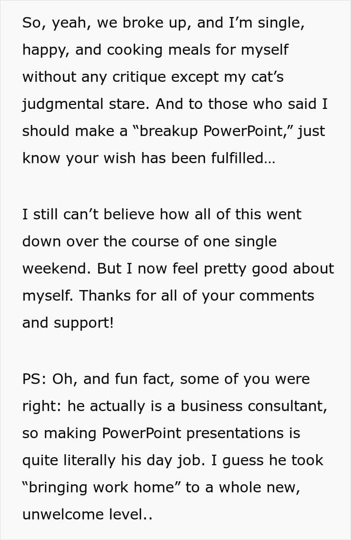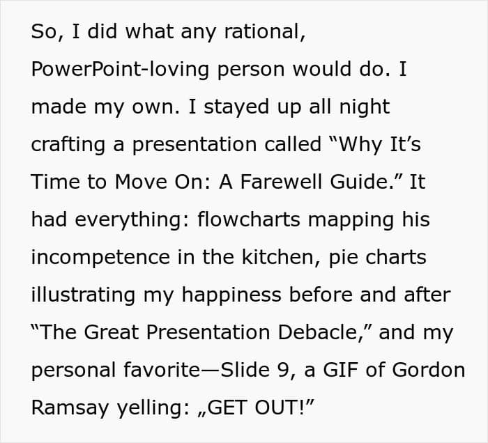 “I think it’s worth noting that, while the PowerPoint presentations were ridiculous and humorous in hindsight, they opened my eyes to how easy it is to overlook certain behaviors in a relationship until they escalate. Sometimes, it takes a seemingly absurd situation to realize you’re not getting the respect or partnership you deserve,” the OP added.