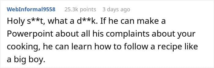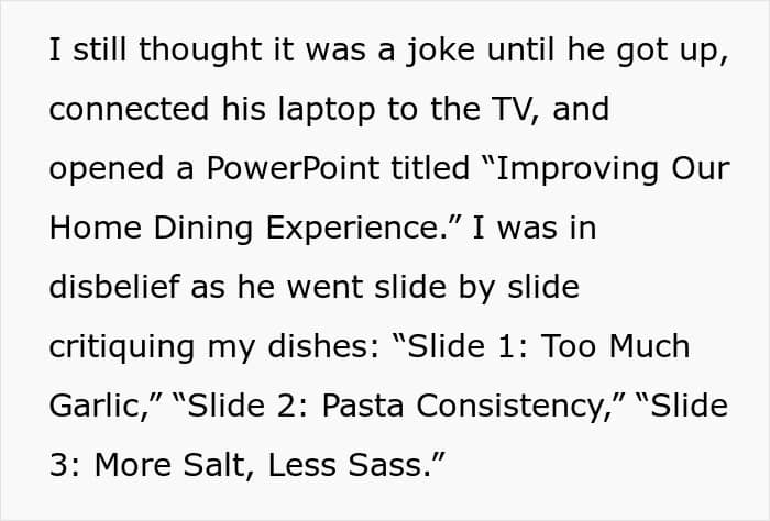 This redditor was one of such partners. That was until her boyfriend criticized her cooking with the help of a PowerPoint presentation. Scroll down to find the full story in her own words below, where you will also find We’s interview with the OP and more details on the situation.