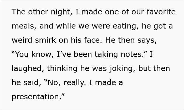 “It wasn’t just the PowerPoint itself but the fact that he thought it was an appropriate way to ‘help’ and critique something I put time and effort into. The moment he connected his laptop and started presenting like we were in a business meeting, I felt an overwhelming mix of disbelief and frustration. I realized that the gesture wasn’t playful or supportive—it felt patronizing and dismissive of the work I was putting in to make our home comfortable and welcoming.”